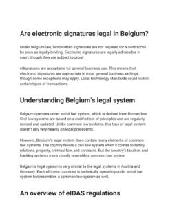 Belgium follows the UNCITRAL model law and is similar to the laws of many European Union member states. It is considered a two-tier jurisdiction because it gives digital signatures the same status as handwritten signatures but also recognizes simple electronic signatures as legal and enforceable. Countries that follow this model give companies the opportunity to select different forms of signatures and customize their business processes based on the form that is most convenient and appropriate for each use case.