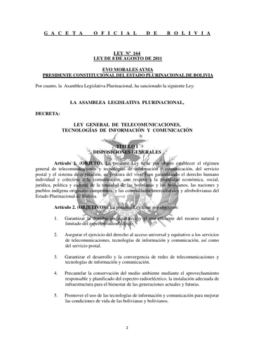 General LAW No. 164 LAW OF AUGUST 8, 2011, Telecommunications, Information and Communication Technologies of Bolivia.pdf